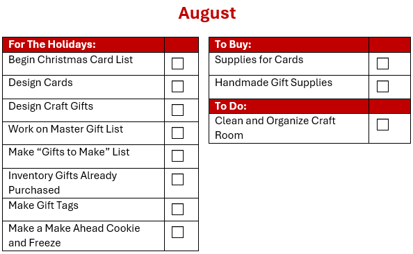 Spend August continuing to develop gift ideas for your list. I don’t necessarily start buying gifts, unless it is something I see that I will not be able to get later (I love gift shopping when I travel). But every time I have an idea I record it, because I KNOW I will not remember it later.