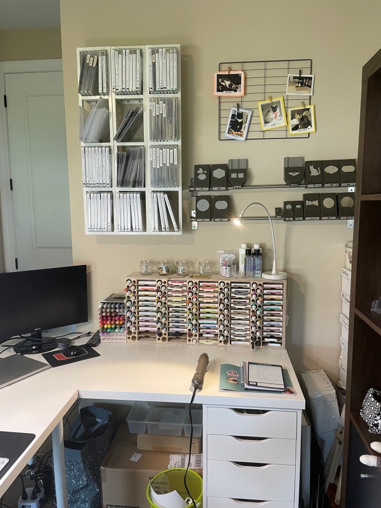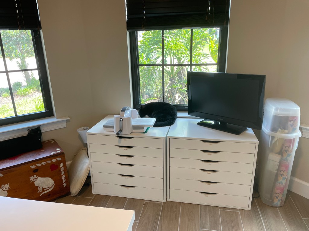 Kallax shelving is great for storage. I added drawers and bins to help with my organization. I also added a cat bed for my babies. The filing cabinet holds all my cardstock. In Florida, you have to protect your papers from the strong sun.