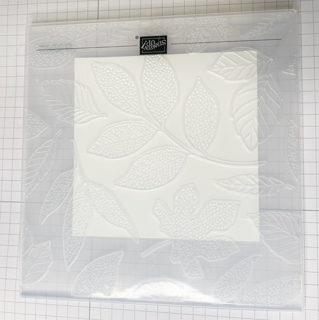 I embossed the Basic White with the Changing Leaves Embossing Folder. You want to make sure the focus leaf is mostly on the white. I have just a tip of one leaf off the edge.