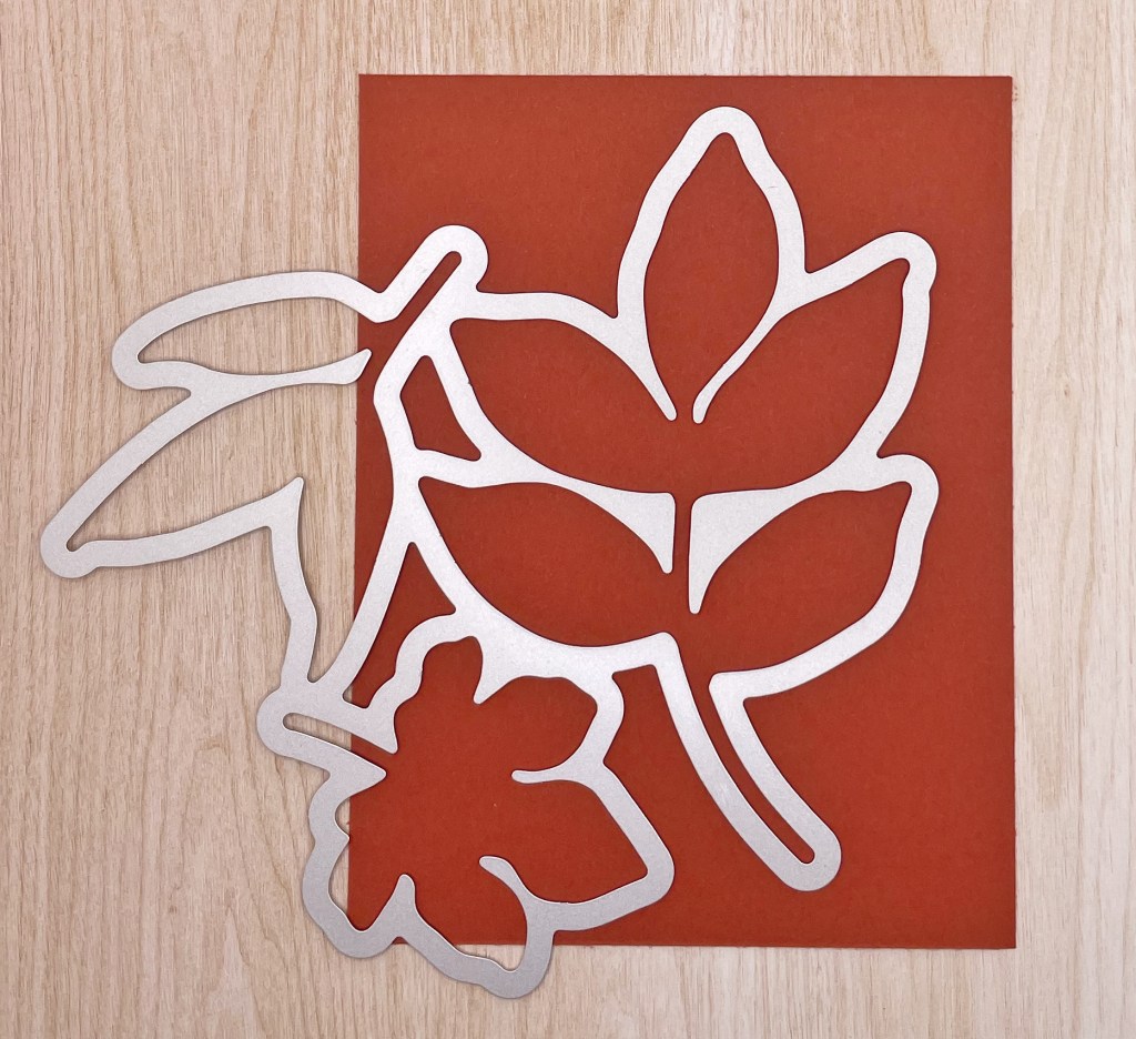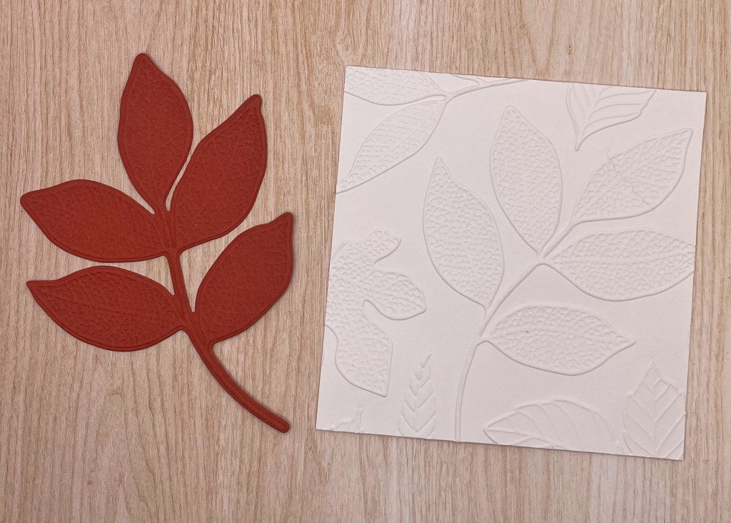 Tape the white to the cardstock base. Then Dimensional the Cajun Craze leaf directly on top of the same leaf on the Basic White.