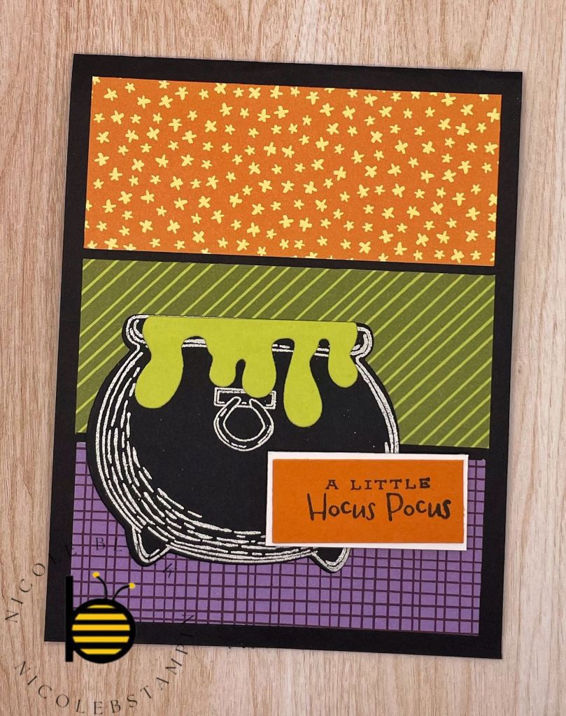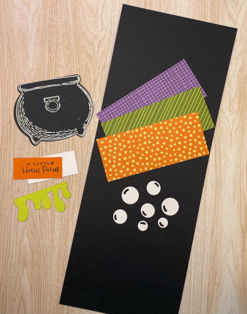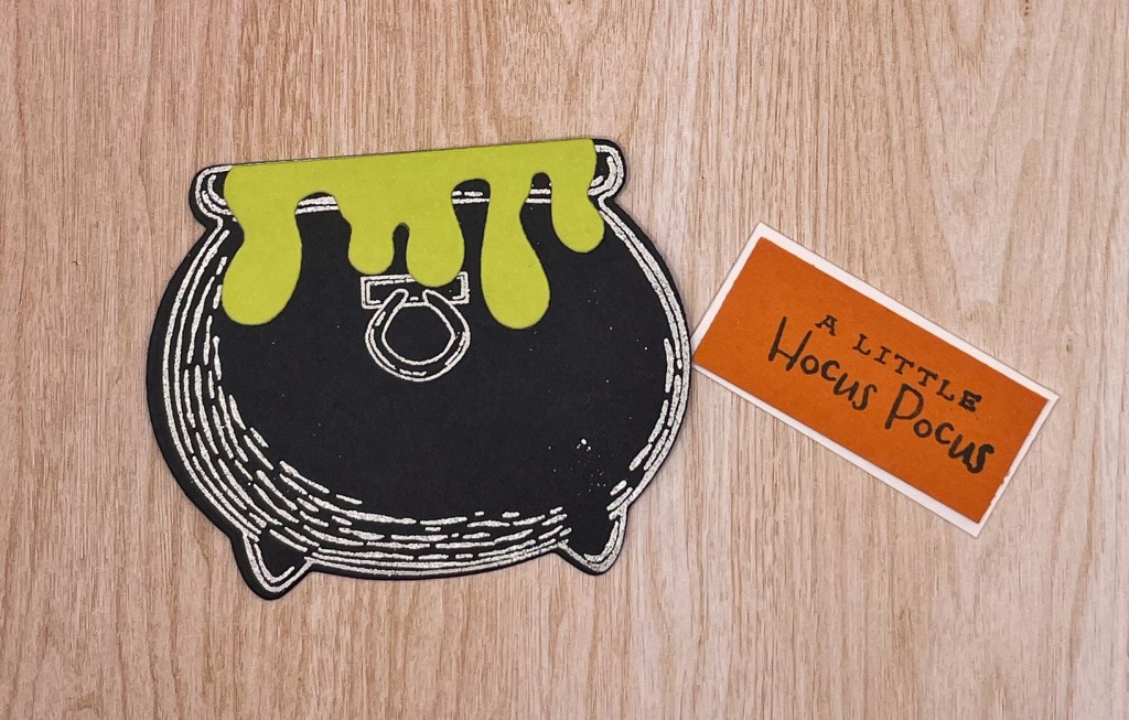 Adhere the cauldron to the card base. The label is adhered with Dimensionals. Then finish with bubbles.