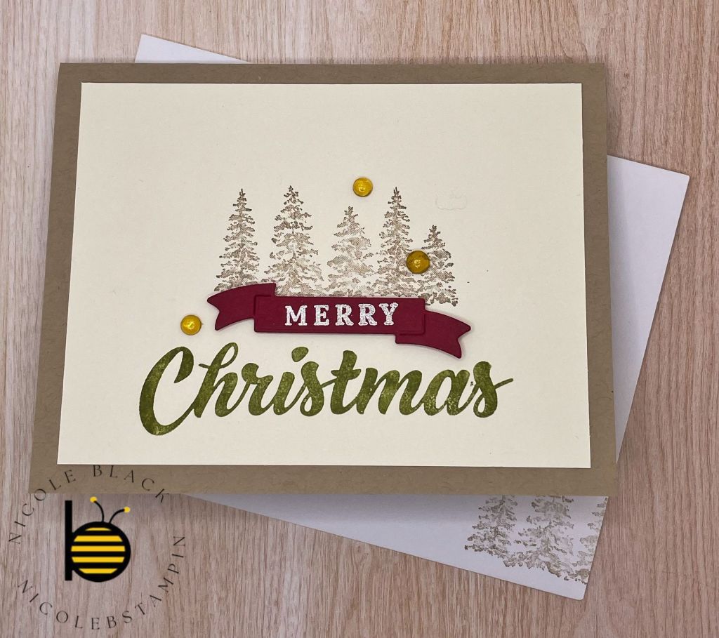 - Stamping: Begin by stamping the trees in Crumb Cake and the word “Christmas” in Old Olive onto a Very Vanilla panel.