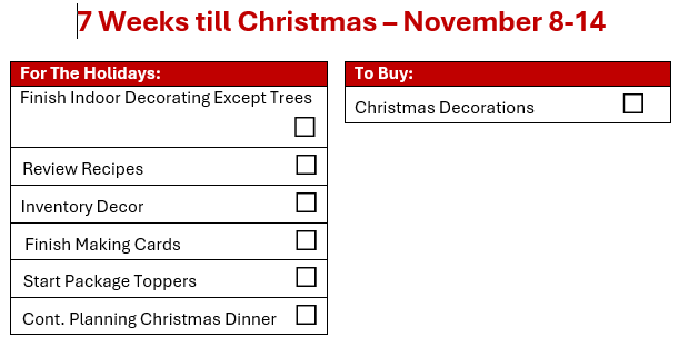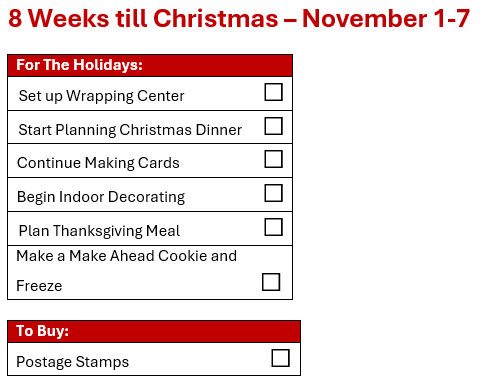 Can you believe it’s November already? This month, we’re breaking down the checklist by week, and I’ll be sharing the checklist in two-week increments. If you want the entire checklist, just check back to my August Post.