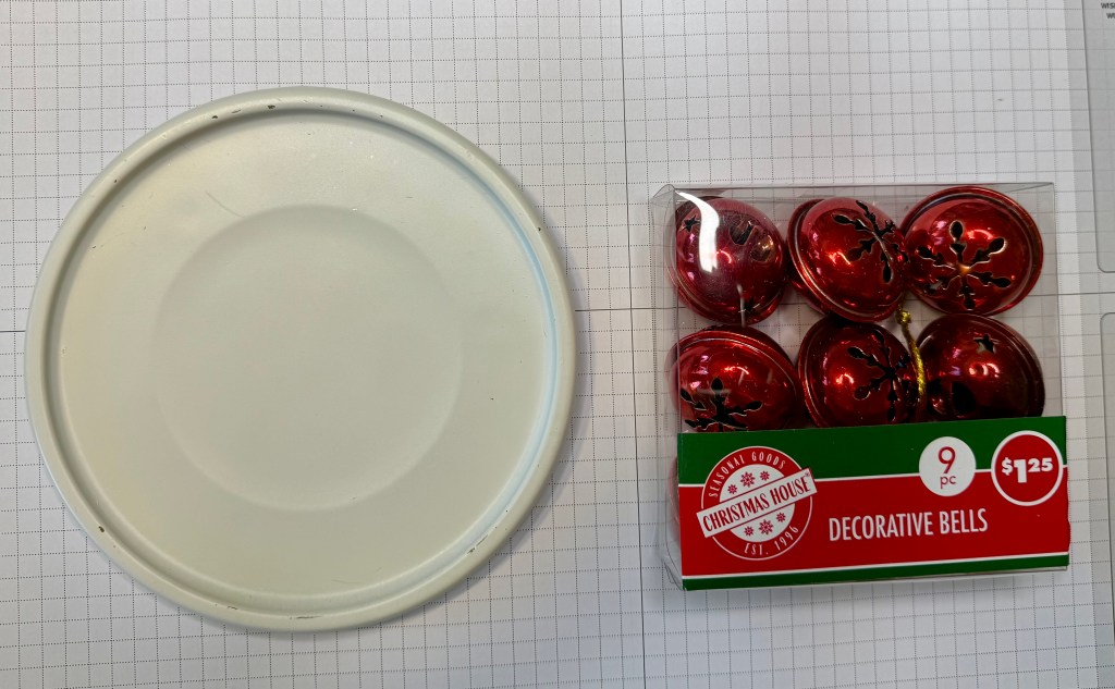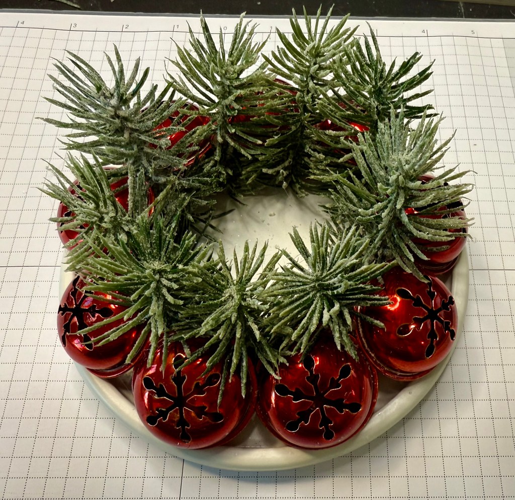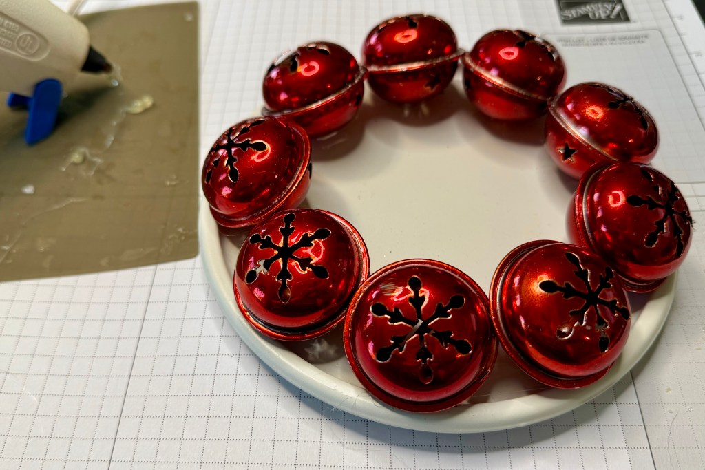 Using a hot glue gun, attach nine bells evenly around the edge of the plate. Press firmly and hold each bell in place for a few seconds to ensure a strong bond.