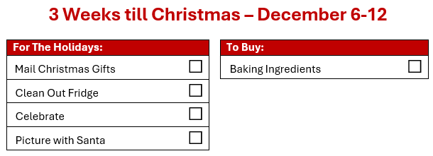 Here’s how I’m breaking things down for the next few weeks to keep everything manageable and merry: