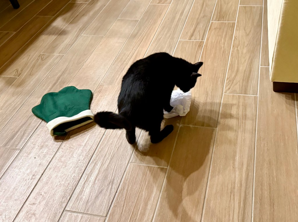 The stockings are simple—just catnip and tissue paper—but our fur babies absolutely love them! Pictured from left to right, clockwise: Berlioz, Ortensia, Calliope (Fuzz), Mochi, and Thalia (Little).