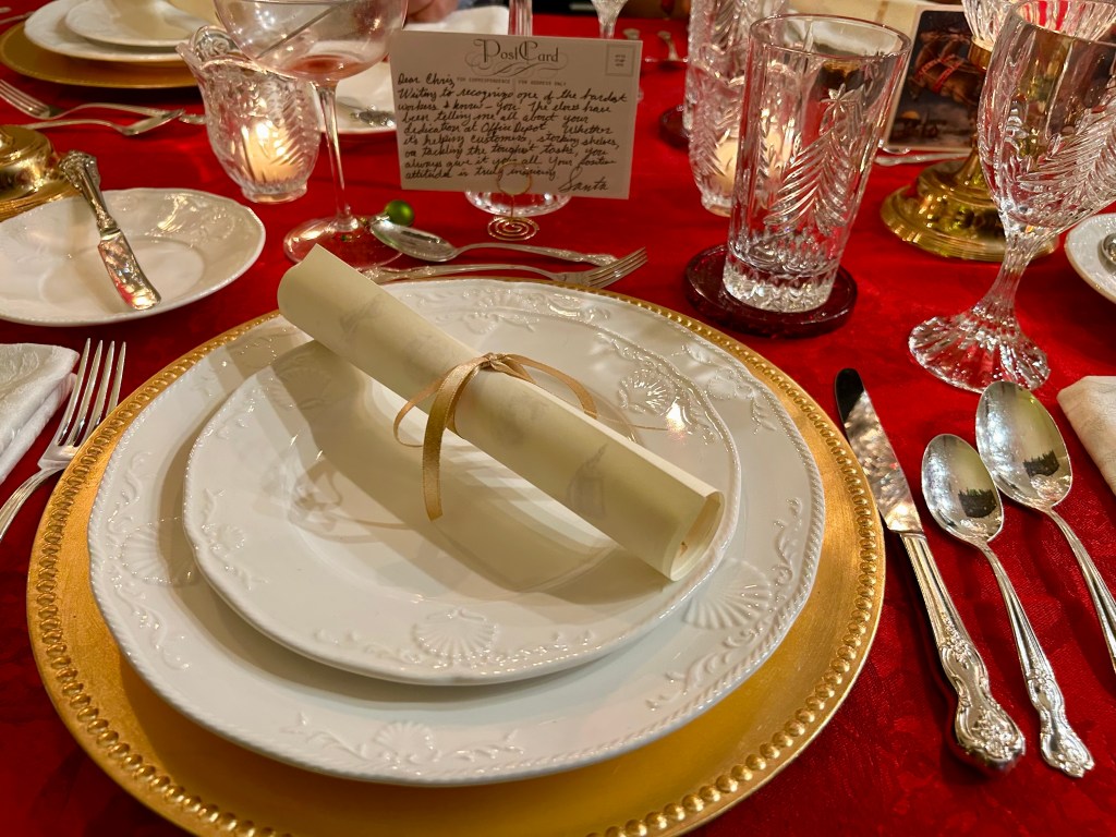 Our family gathered around the table, beautifully set in the French formal style. Each place setting included a printed menu and a postcard from Santa. In France, every letter sent to Santa receives a reply, and I wanted to bring that charming tradition to our dinner.