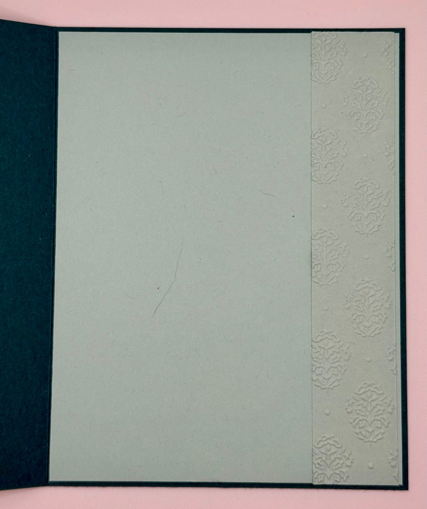 For the inside, I did something a little different. Instead of stamping an image, I embossed a strip of Pool Party cardstock and adhered it along the edge. Since the front of the card is cut short, that embossed strip peeks through even when the card is closed—such a subtle but beautiful detail.