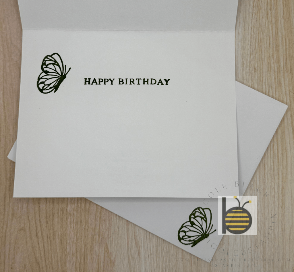 To finish things off, I stamped the inside of the card and the envelope in Mossy Meadow. Looking back, I wish I had used some of the leftover scraps from the die cuts to decorate the inside, too—it would have carried the design through so nicely. Something I’ll keep in mind for next time!
