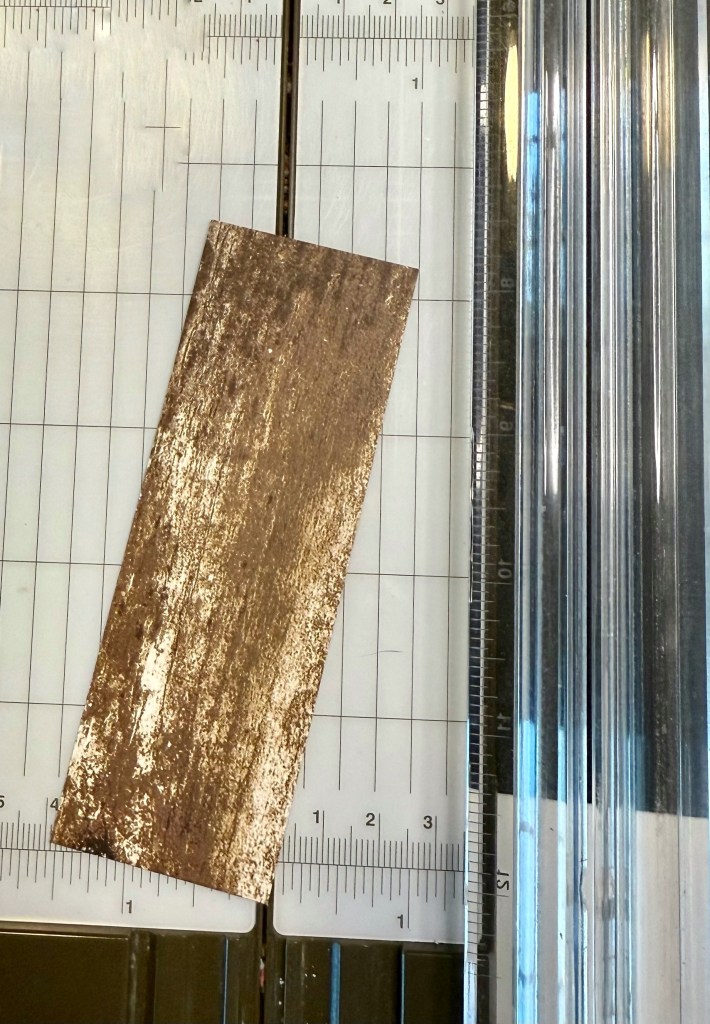 I spotted someone using the Country Woods Designer Series Paper (DSP) to mimic a tabletop, and it looked so sharp that I had to try it myself. For the angled piece, I started with a strip cut to 4-5/8″ x 1-3/4″. Then, using my trimmer, I lined up one corner on the cutting track and the opposite corner at the 1″ mark to get that perfect angled edge. Just make sure you’re cutting in the direction you want the slope to appear on your card!