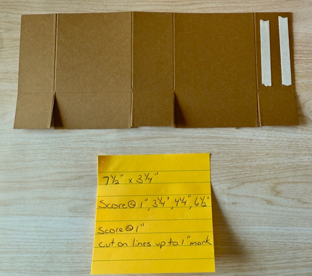 - Score lengthwise at 1″, 3-1/4″, 4-1/4″, and 6-1/2″.