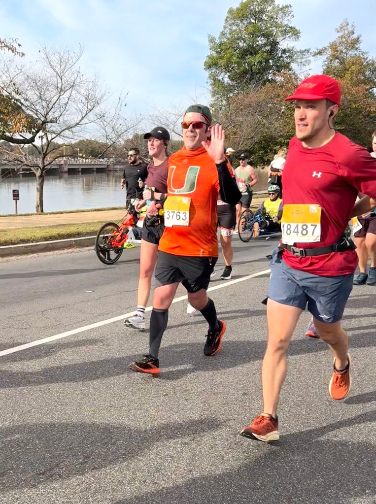 Race day dawned absolutely beautiful — chilly in the low 40s to start, warming up to the high 50s under clear skies and calm winds. Perfect running weather! I managed to catch Nathan at five different spots along the course. He always manages to spot me in the crowd, and each time he stopped for a quick kiss before heading off again. ❤️