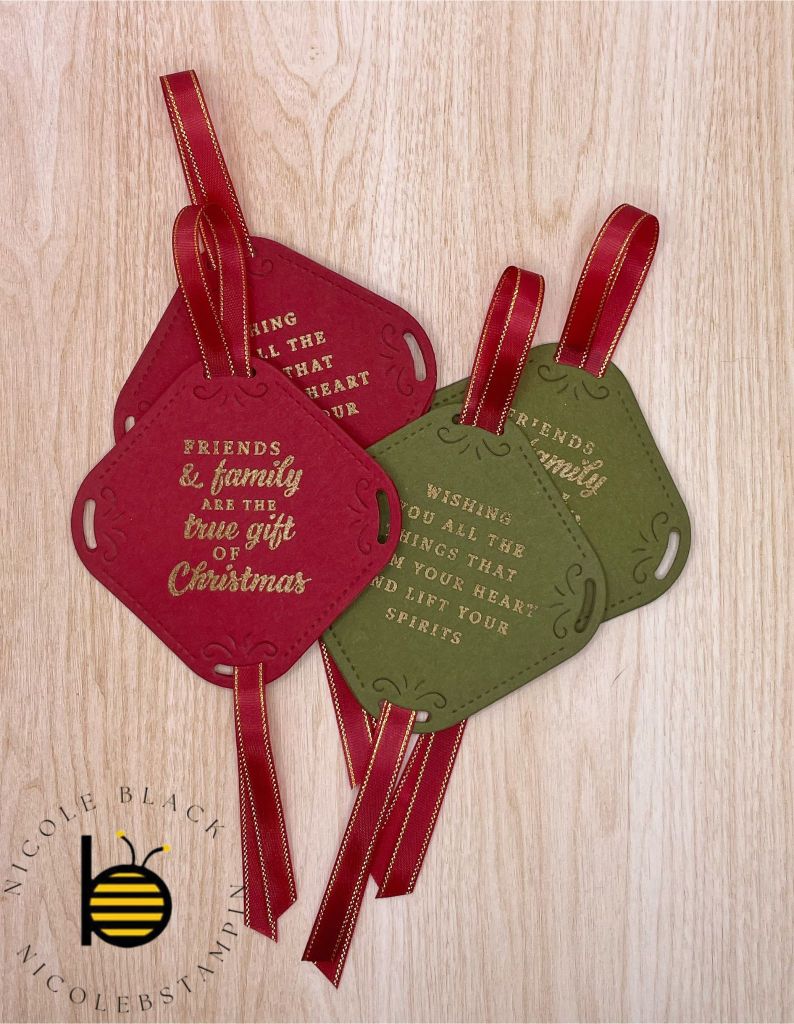 I used Cherry Cobbler and Mossy Meadow to create these tags. The sayings are stamped in Versamark and then heat embossed in gold. The ribbon is the Cherry Cobbler and Gold Ribbon. On the back I heat embossed the words To and From from Greetings of the Season Set. Checkout the video on how they are assembled.